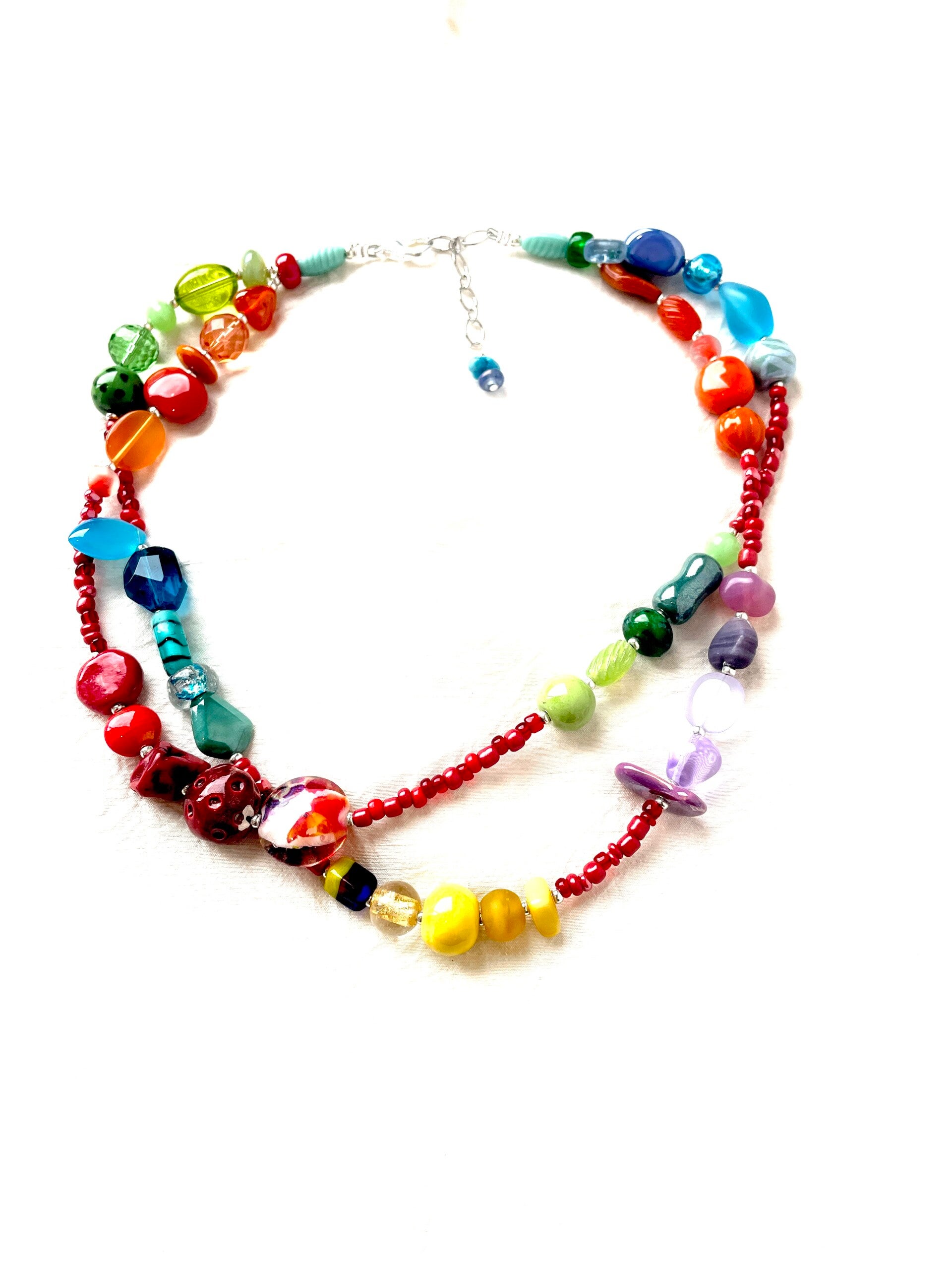 Een 2-strand ketting met diverse kleine kralen in een assorti kleuren.