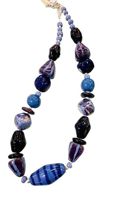 Collier met mengeling van keramiek kralen in diepblauwe kleuren, beschilderd met diverse patronen.