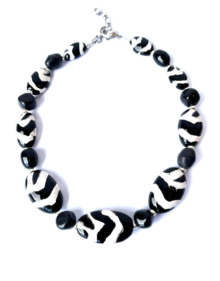 Grote, platte ovalen kralen in Zebrapatroon beschilderd.