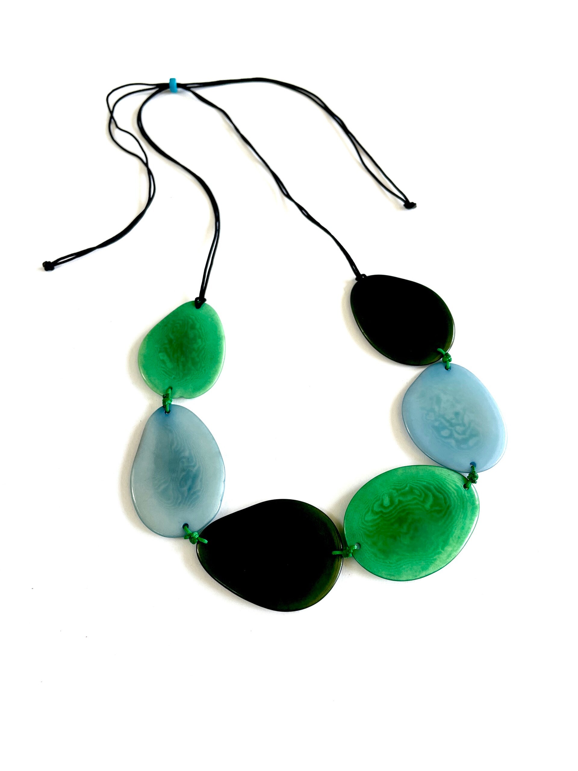 Ketting model Toja, 6 platte tagua kralen.Geregen op zwart waxkoord.