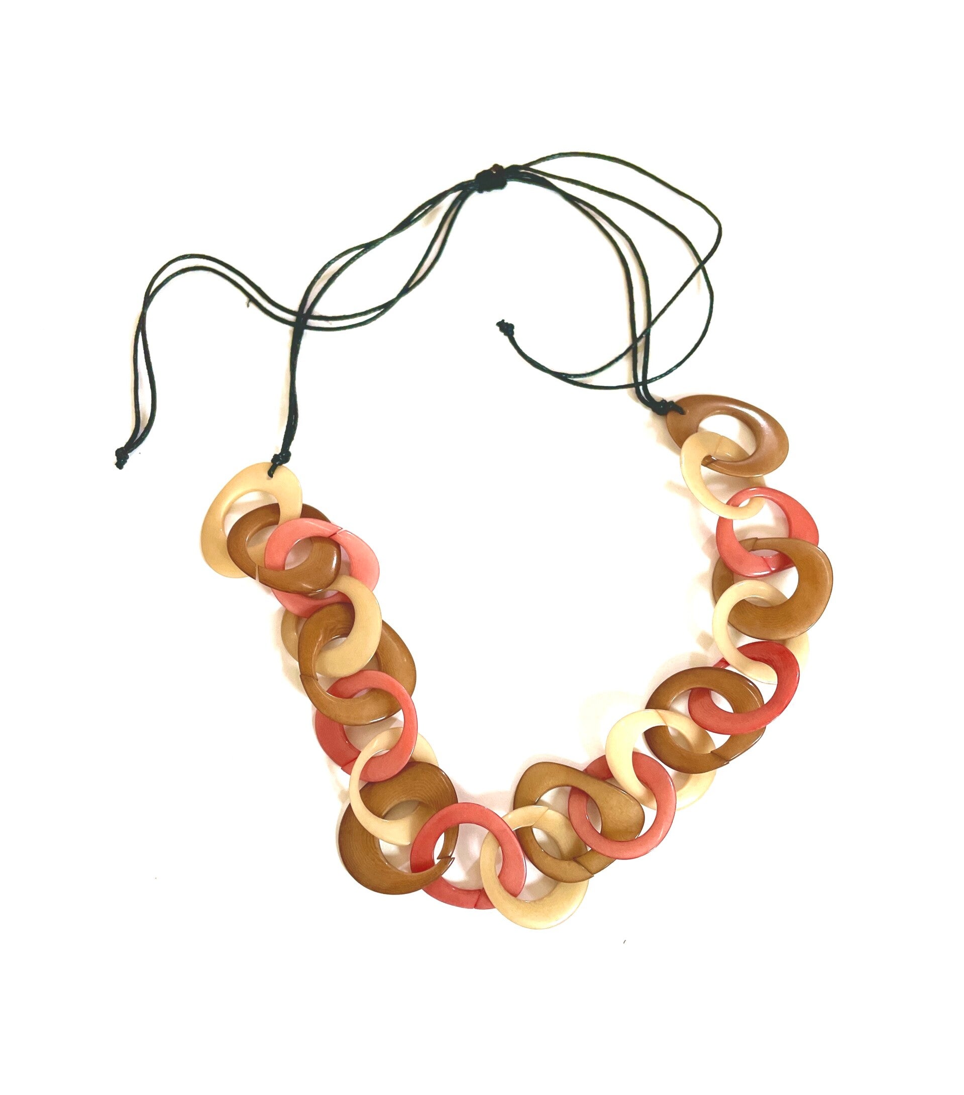Dit model ketting kenmerkt zich door zijn unieke ontwerp waarbij meerere schakels aan elkaar geregen zijn tot een opvallend geheel. De schakels, gemaakt van de taguanoot - ook wel bekend als palm ivoor - zijn zorgvuldig gesneden en gepolijst om een unieke en natuurlijke uitstraling te behouden.