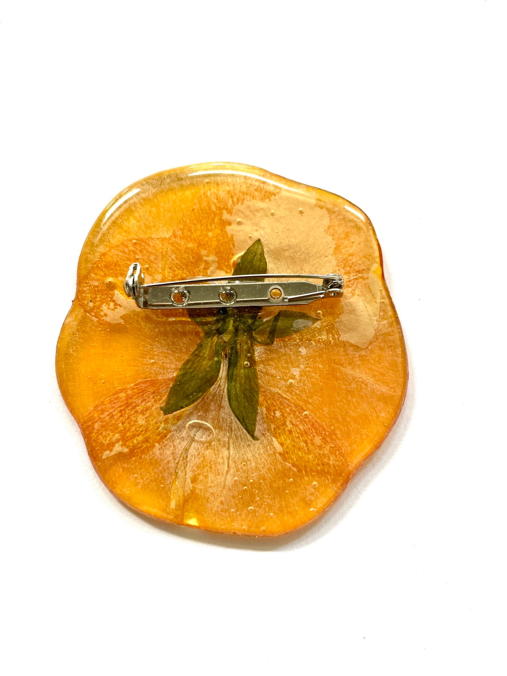 Broche gemaakt van een vioolbloem , ingelegd in hars, Kleur: Okergeel. Grootte: ø 7 cm.