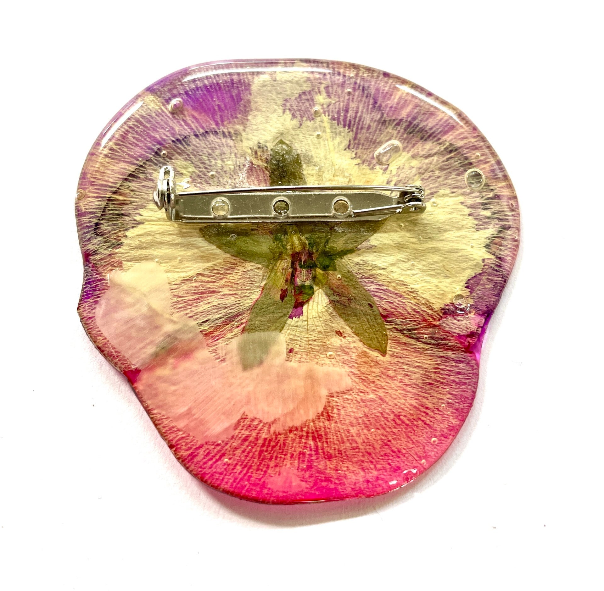 Broche gemaakt van een vioolbloem , ingelegd in hars, Kleur: Violet met Fuchsia. Grootte: ø 7 cm.