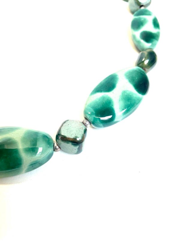 Kette Angela Grunn Ann, Länge ca. 42 cm, Nickelfreier Verschluss. Keramikperlen handgeformt, handbemalt, zweimal gebrannt. Herstellung: Kazuri Kenia, WFTO-Mitglied.