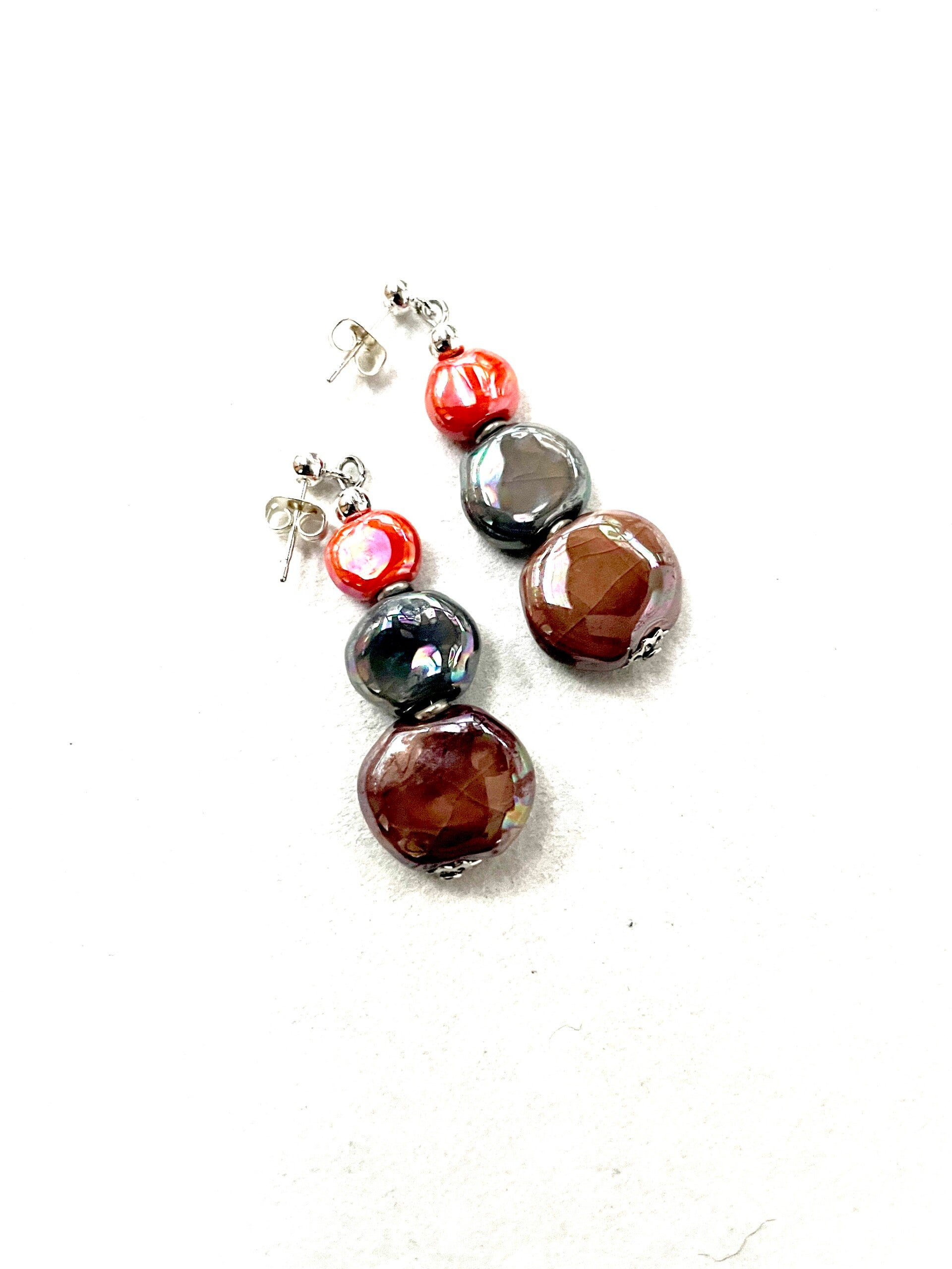 Oorbel tombola, drie platte ronde keramieksteentjes aan een steker.